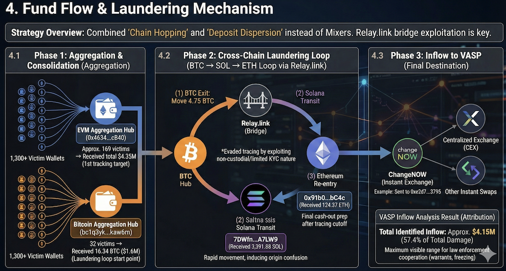 This loop is engineered to defeat linear, single-chain tracing. Relay.link’s non-custodial model and limited KYC touchpoints appear to have been used to