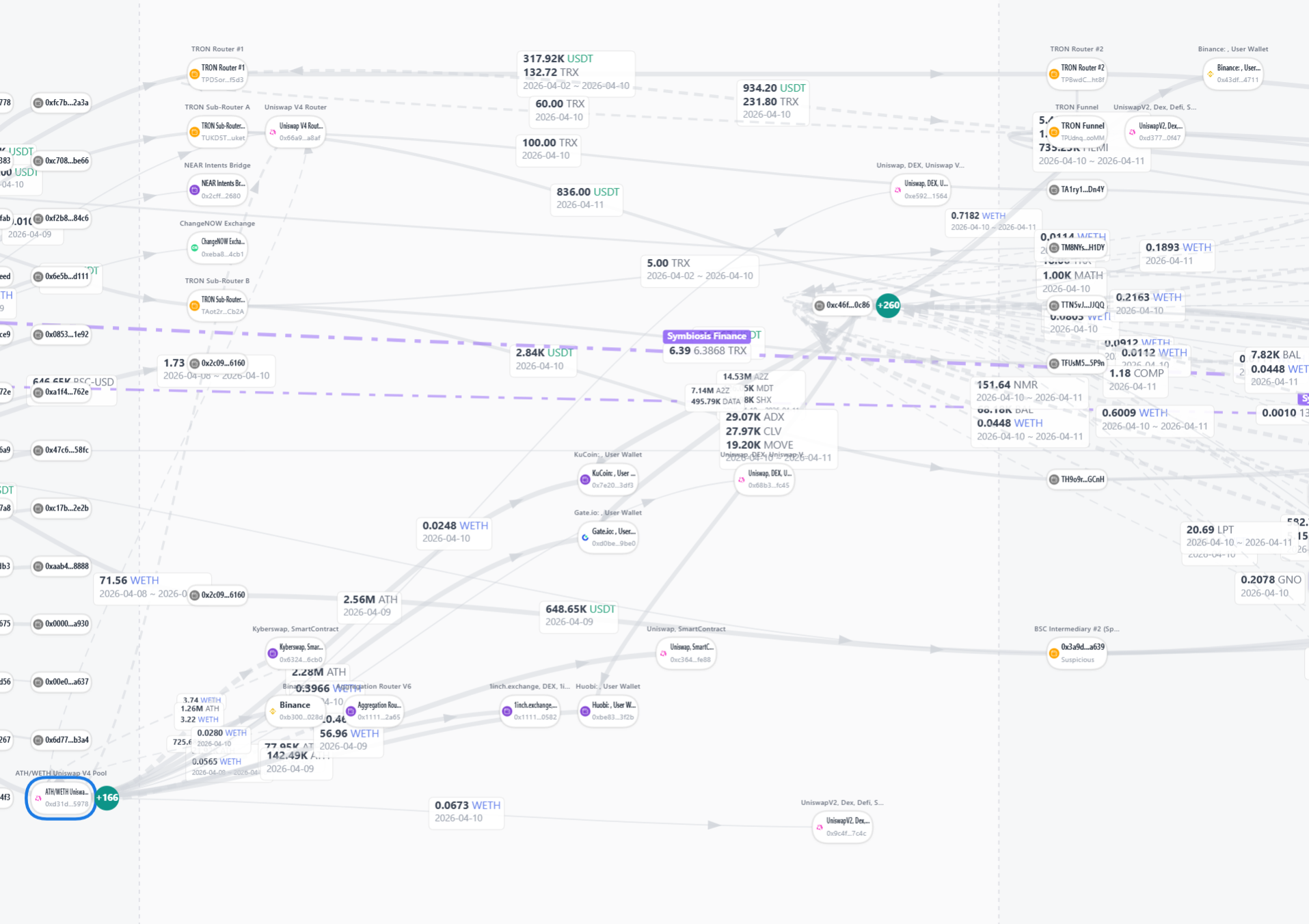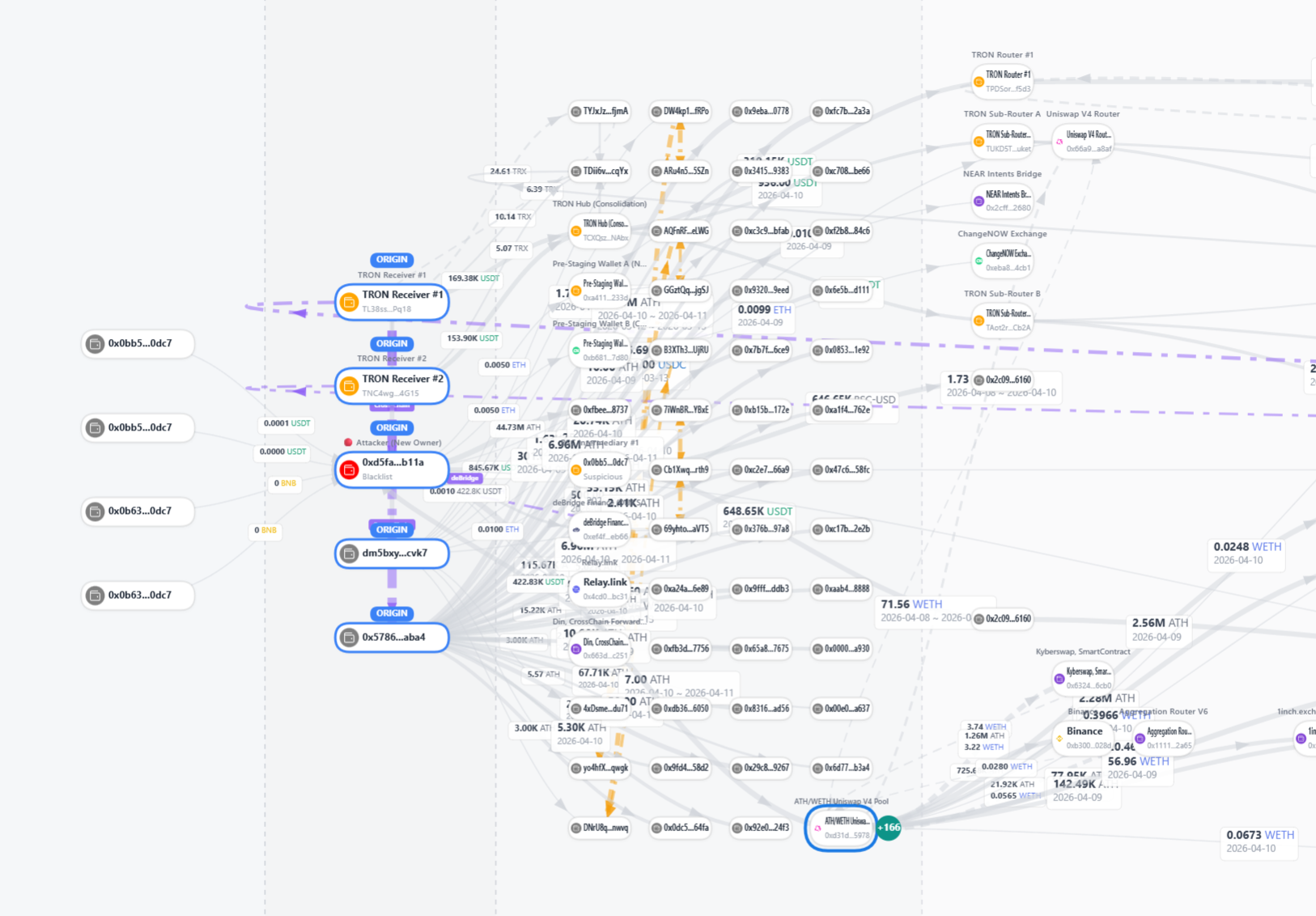 Upon arriving on TRON, the funds were consolidated in a central hub (TCXQszGad9YRGgnPefKfnTc8wrTHxXNAbx) and passed through a complex 4-hop routing chain (Router #1 -> #2 -> #3 -> Funnel) designed to completely obfuscate the source of the funds. As of April 11, approximately 318,000 USDT has consolidated in a single dormant TRON address (TKX4y5jbKc43x8KkSBSiEF5sJWU6e2ZGHA).