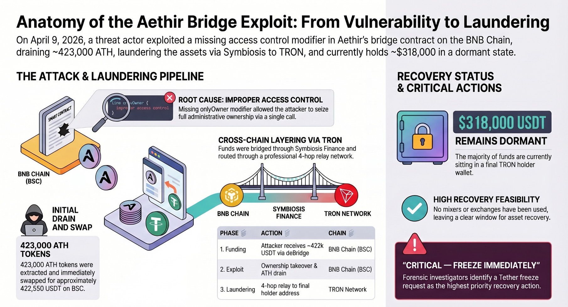 As a global leader in decentralized GPU cloud computing and AI infrastructure, Aethir bears the responsibility of maintaining the highest standards of security and transparency alongside our technological innovations. On April 9, 2026, a malicious exploit attempt occurred on the AethirOFTAdapter contract, one of Aethir's cross-chain bridge infrastructures.